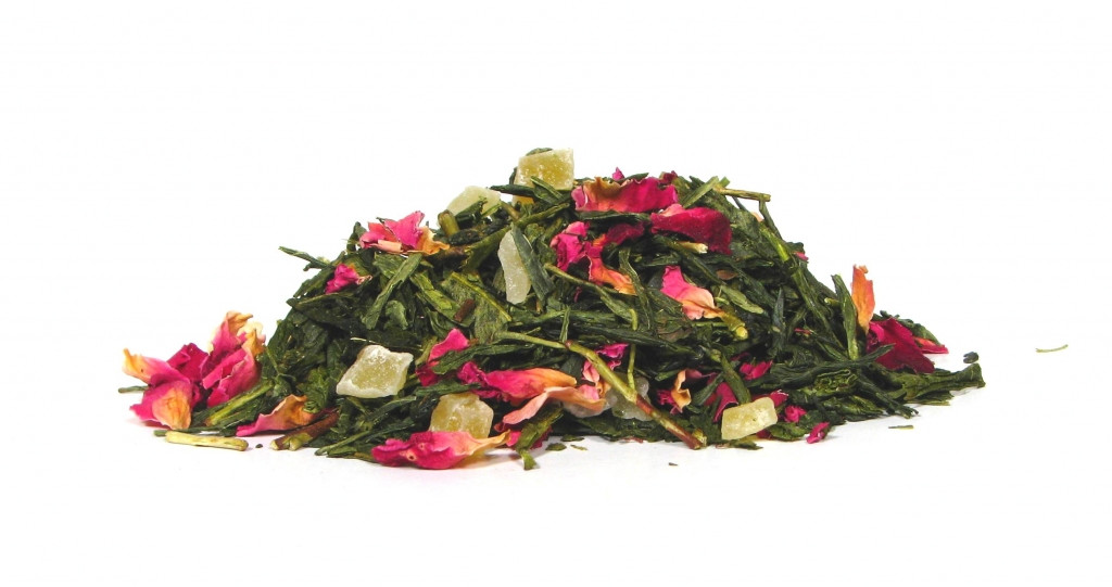 Składniki: Sencha, papaja kandyzowana, płatki róży, aromat