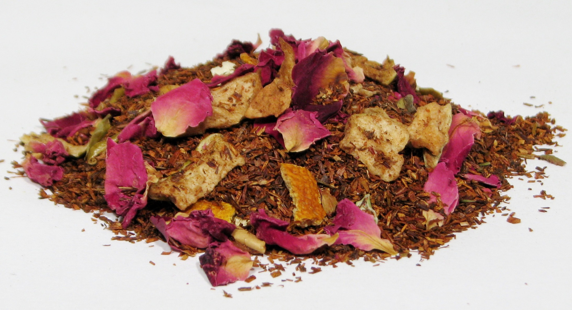 Składniki: Rooibos (Aspalat prosty), kawałki jabłka, skórka pomarańczowa, płatki różane, aromat