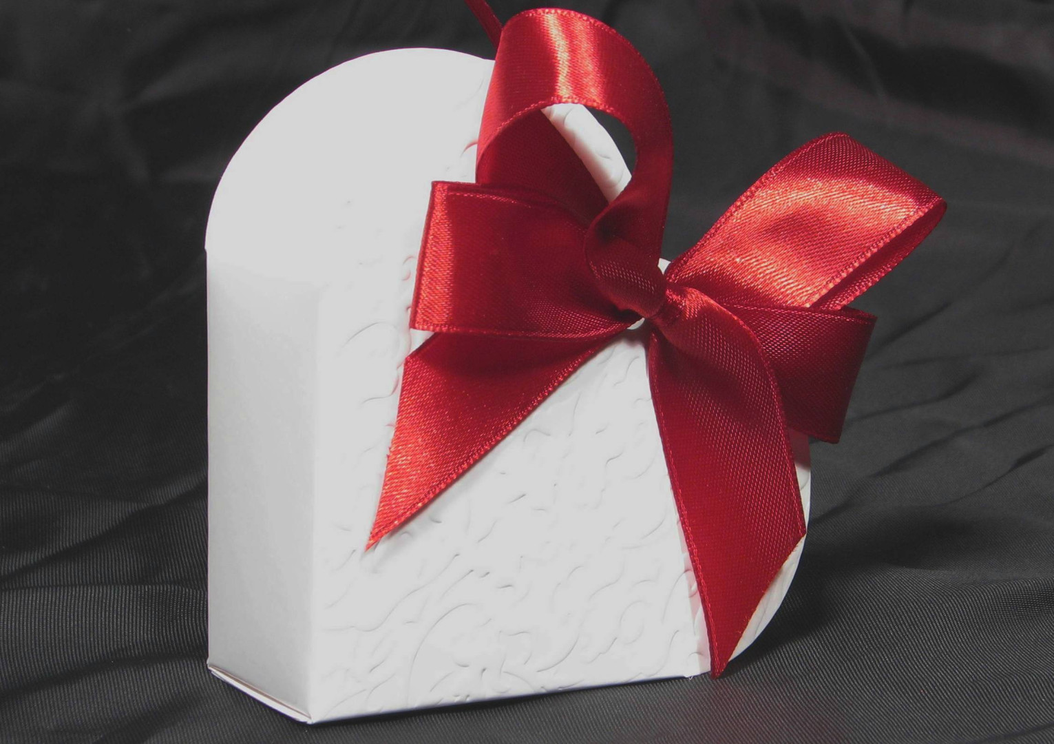 Tekstylna kokarda w kolorze czerwonym, pasująca do tekturowych serc i pudełeczek na herbaty kwitnące, z długą wstążeczką do mocowania na pudełku.