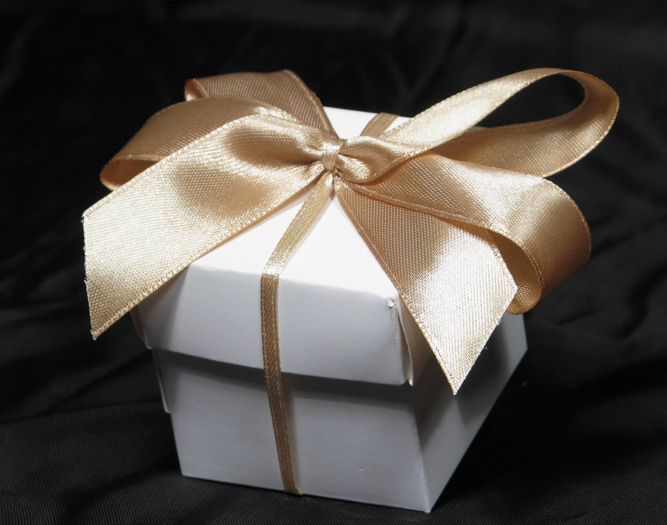 Tekstylna kokarda w kolorze złotym, pasująca do tekturowych serc i pudełeczek na herbaty kwitnące, z długą wstążeczką do mocowania na pudełku.