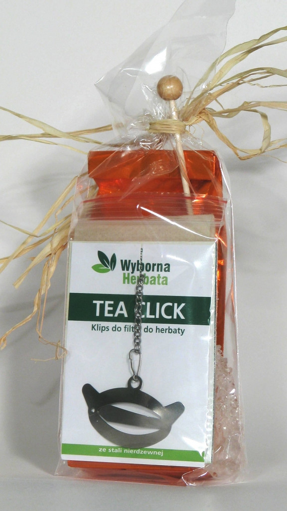Komlet prezentowy z herbatą 50 g , z etykietą na której umieszczono opis herbaty oraz sposób jej parzenia, pałeczka cukrowa, klips 'metalowy czajaniczej' do papierowych filtrów oraz gratis ulotka 'Sztuka parzenia herbaty' i 2 filtry papierowe na próbę.