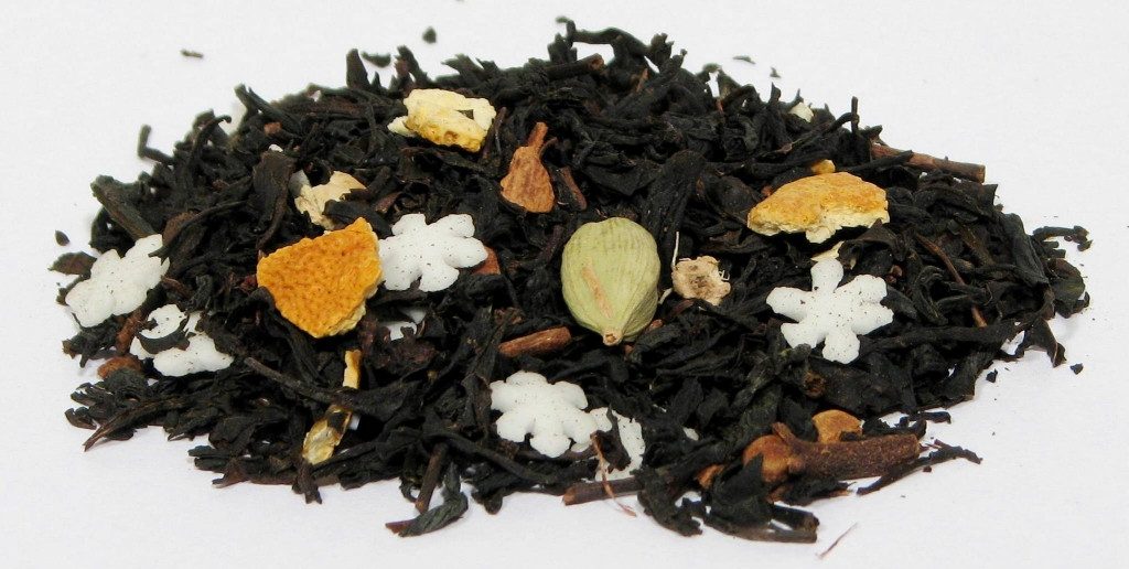 Składniki: herbata czarna, skórka pomarańczy, kardamon, goździki, cynamon, kawałki imbiru, cukrowe śnieżynki, aromat