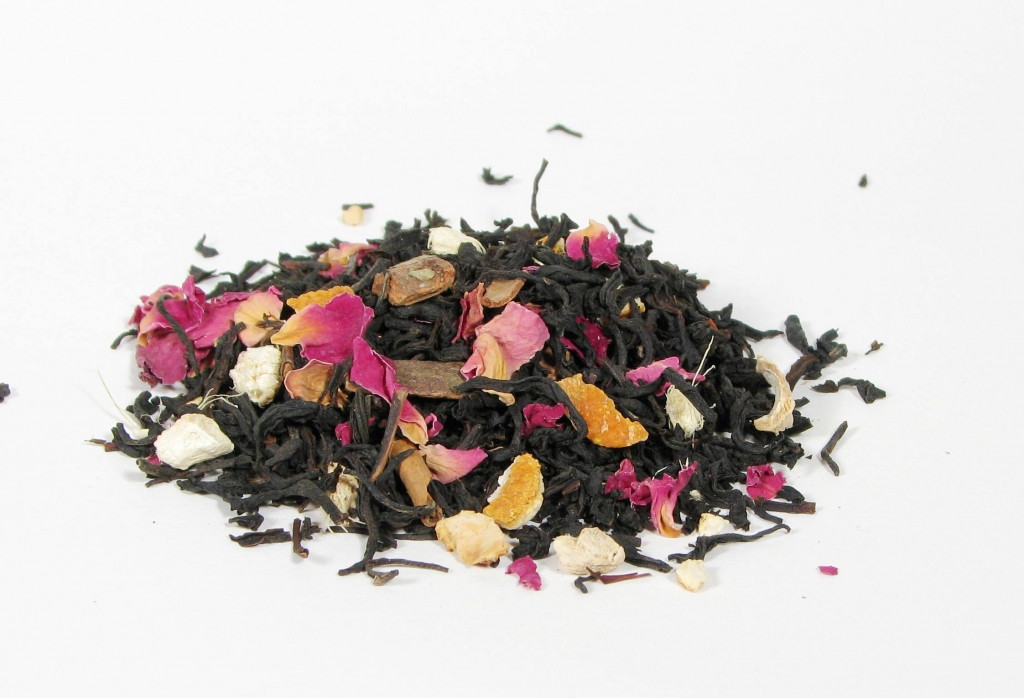 Składniki: czarna herbata, imbir, cynamon, pomarańcza, płatki róż, aromat