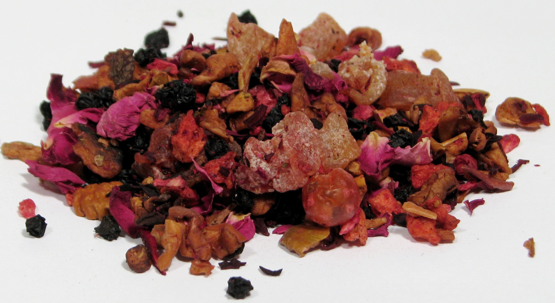 Składniki: Jabłko suszone, dzika róża, owoc czarnego bzu, hibiskus, owoc papai, płatki róż, truskawki liofilizowane, czerwona porzeczka liofilizowana, aromat