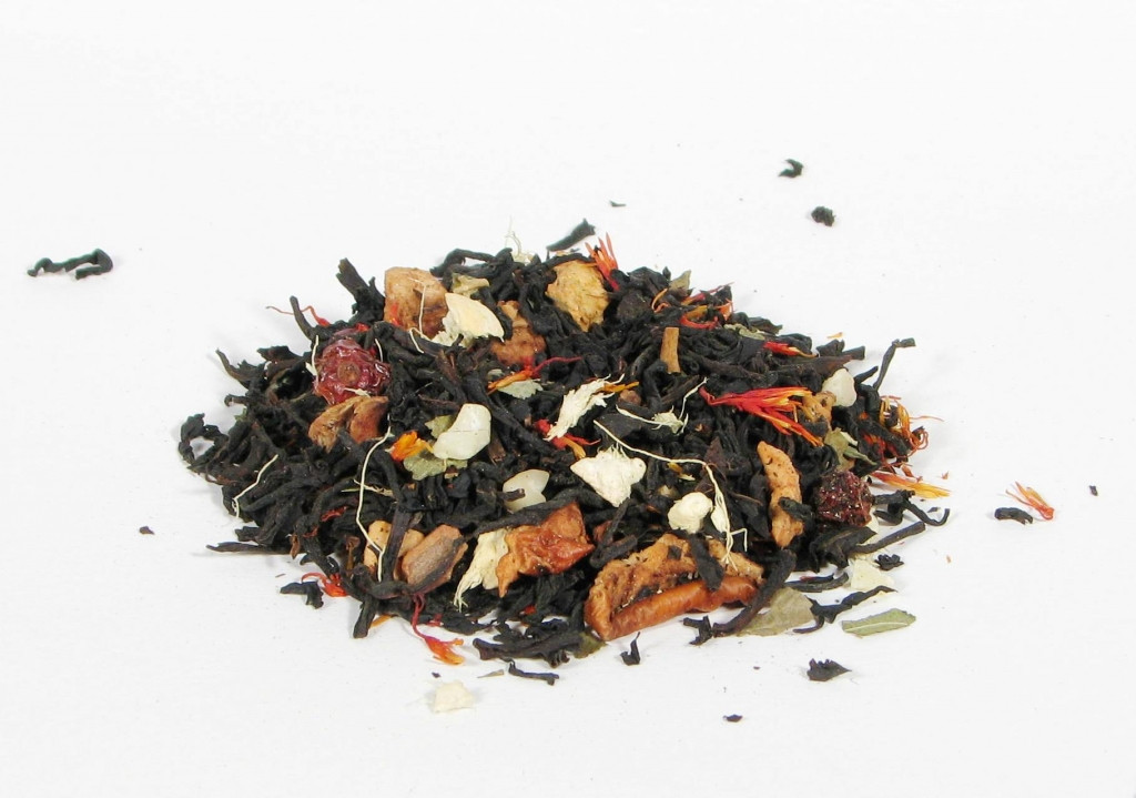 Składniki: herbata czarna, cynamon, jabłko, kawałki imbiru, liście porzeczki, czerwona porzeczka, kawałki pomarańczy, saflor, aromat