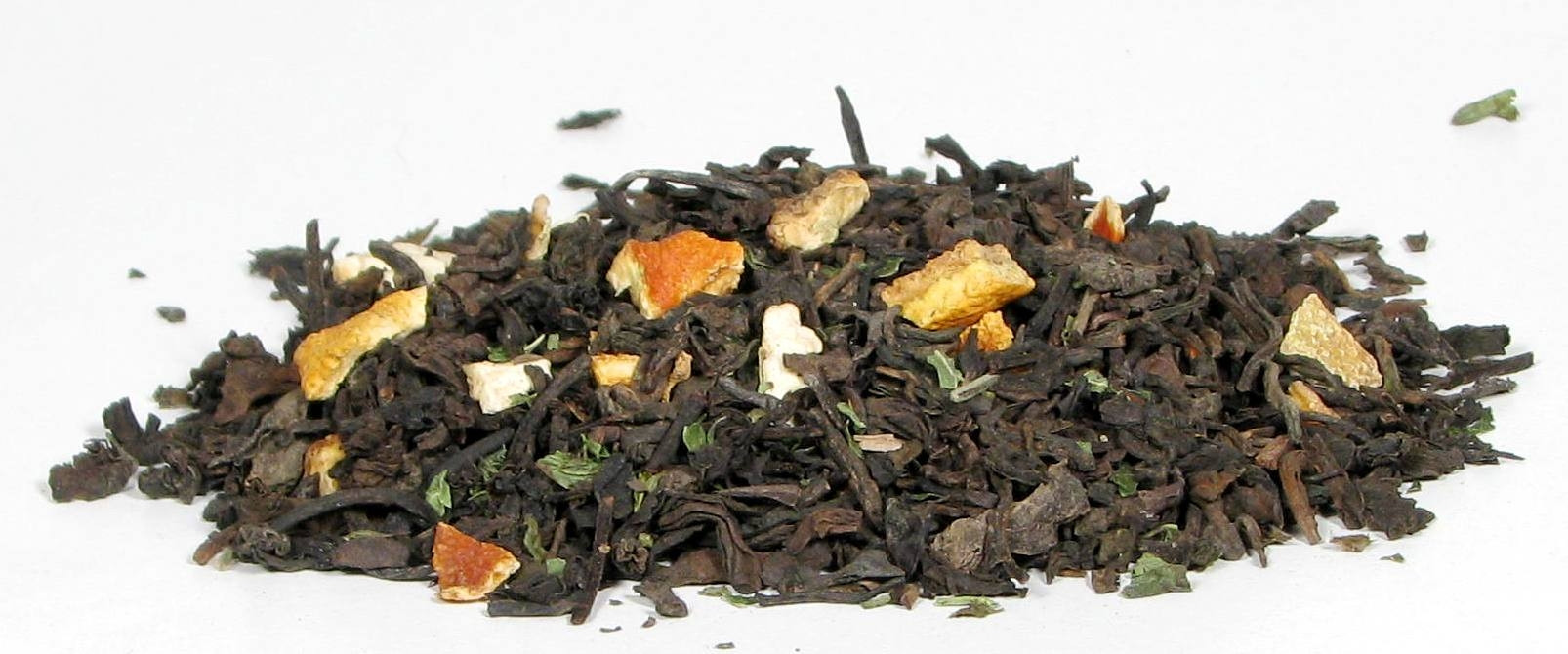 Składniki: Pu-Erh, mięta pieprzowa, kawałki pomarańczy, skórka cytrynowa, aromat owoców cytrusowych