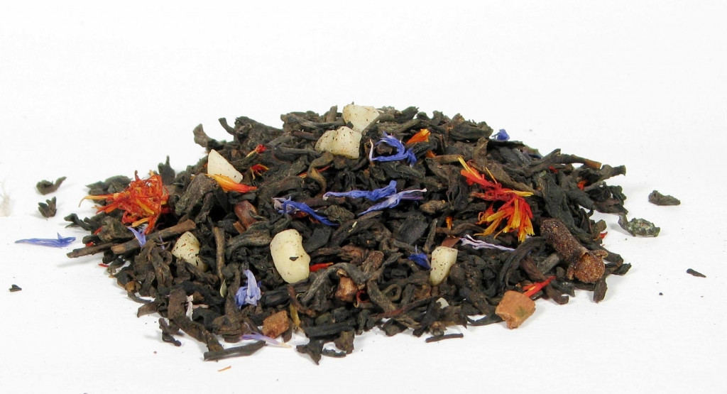 Składniki: Pu-Erh, cynamon, kawałki migdałów, goździki, bławatek, saflor, aromat cynamonowo-migdałowo-mandarynkowy