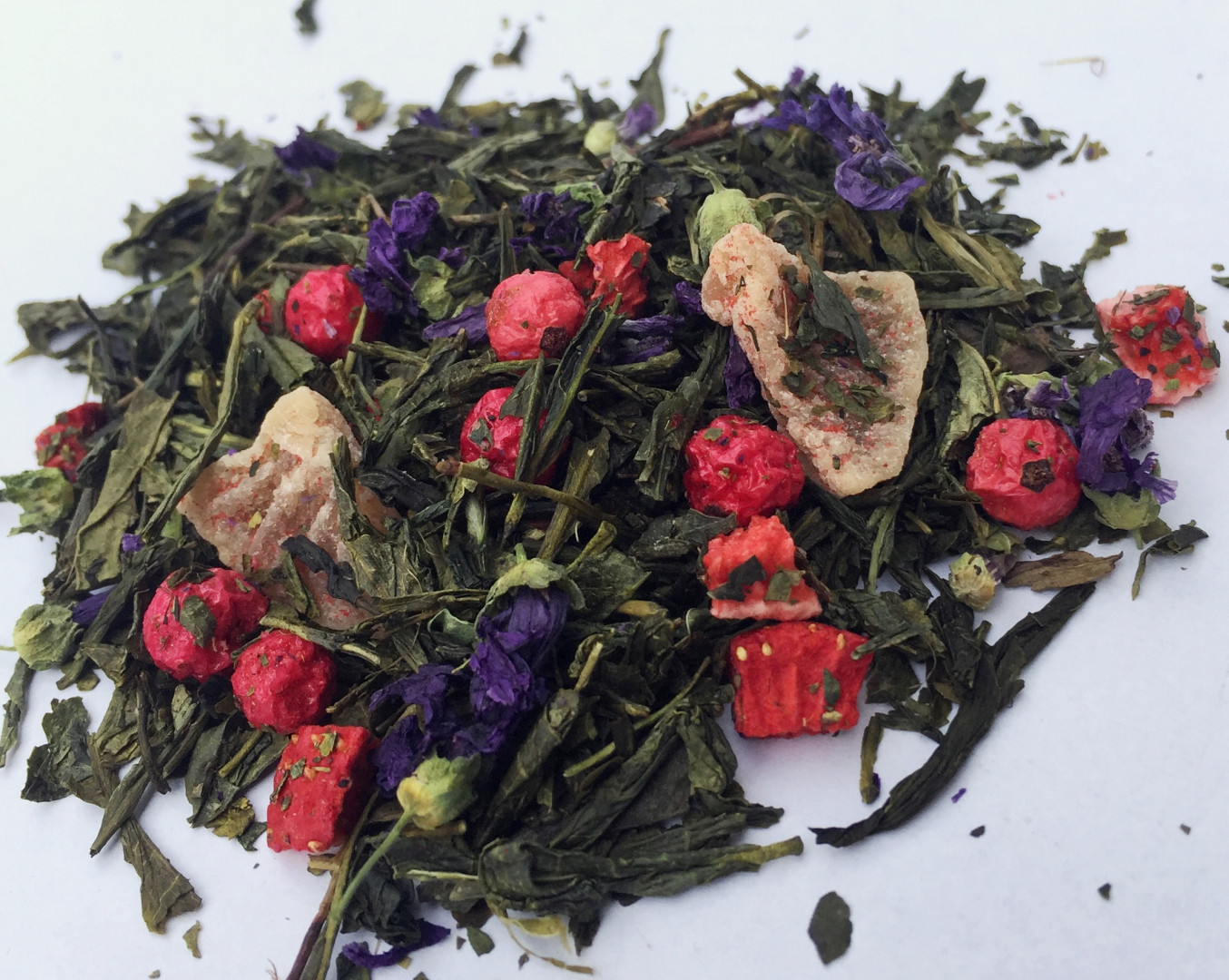 Składniki: herbata zielona Sencha, kawałki ananasa, truskawki liofilizowane, porzeczki liofilizowane, kwiat malwy, aromat