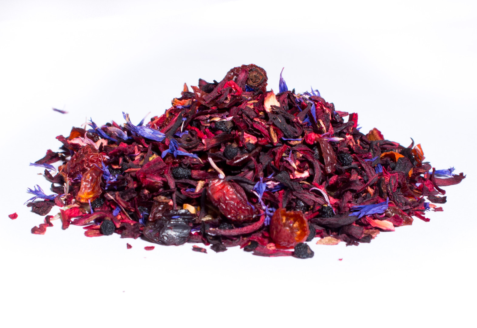 Składniki: hibiskus, owoc dzikiej róży i czarnego bzu, rodzynki, malina liofilizowana, bławatek, aromat