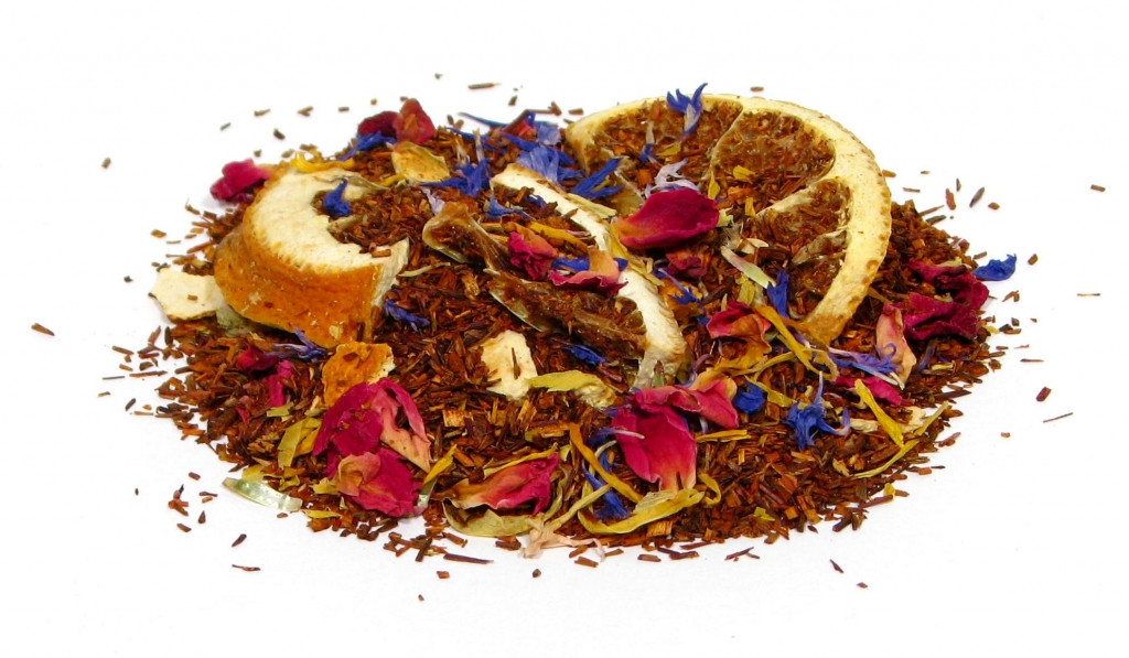 Składniki: Rooibos, ćwiartki pomarańczy, skórka pomarańczy, płatki róż, bławatek, kwiat słonecznika, aromat czekoladowo-pomarańczowy