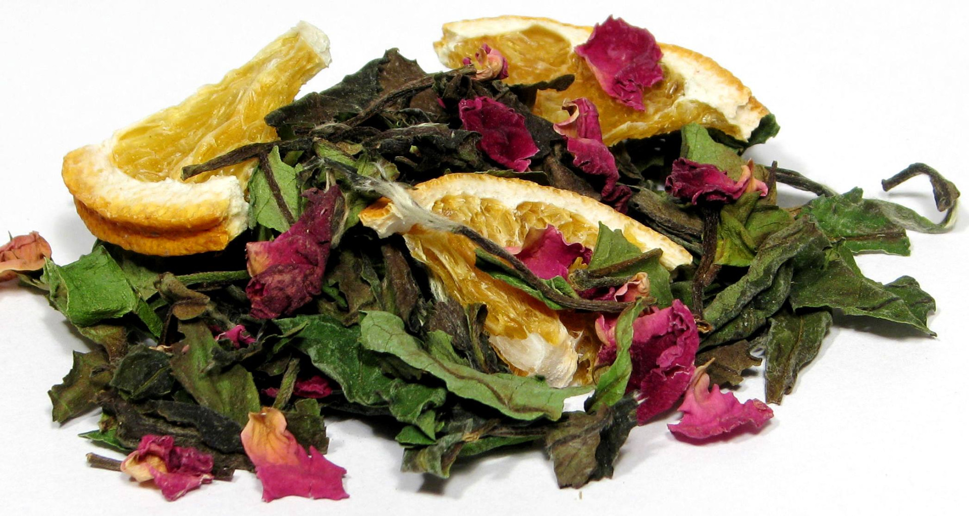 Składniki: herbata biała Pai Mu Tan, ćwiartki pomarańczy, trawa cytrynowa, płatki róży, aromat