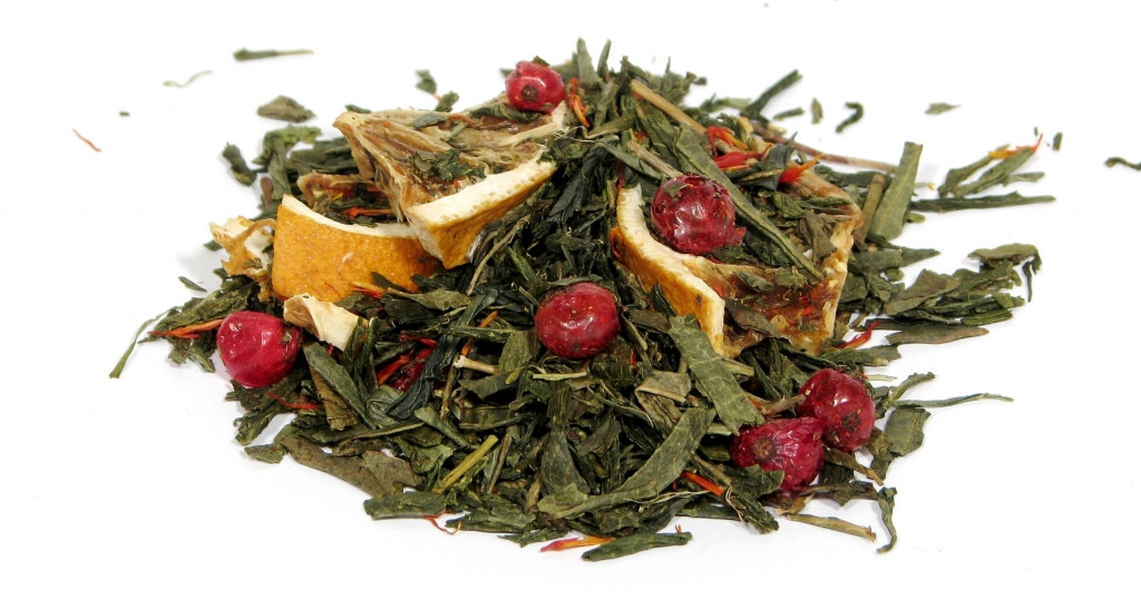 Składniki: herbata zielona Sencha, ćwiartki pomarańczy, porzeczka liofilizowana, saflor, aromat