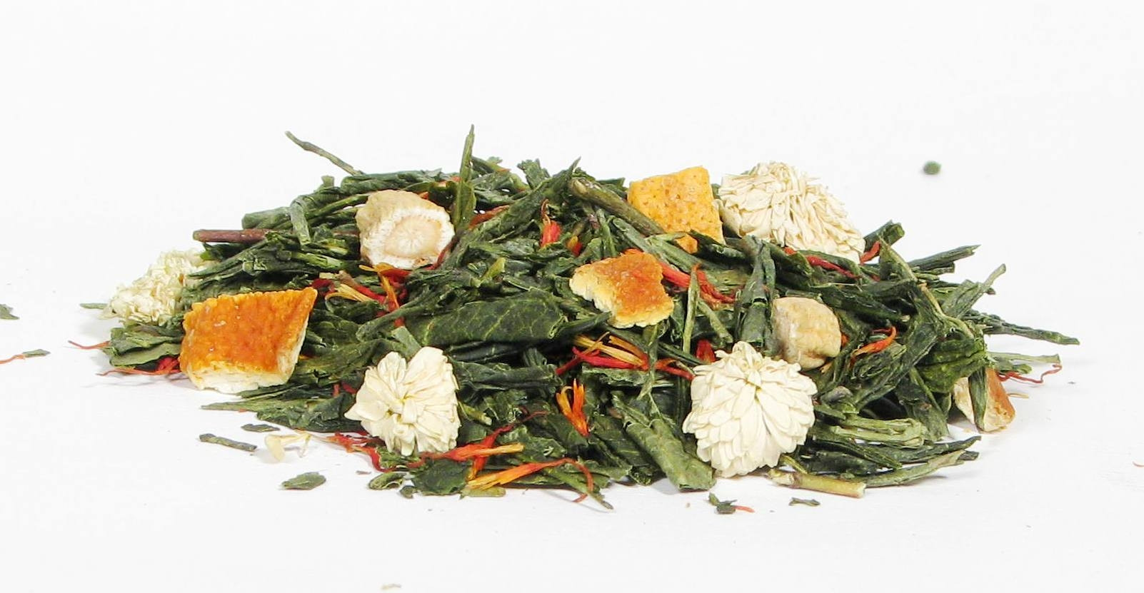 Składniki: herbata zielona Sencha, kawałki żeń-szenia, kawałki pomarańczy, saflor, rumianek rzymski, aromat